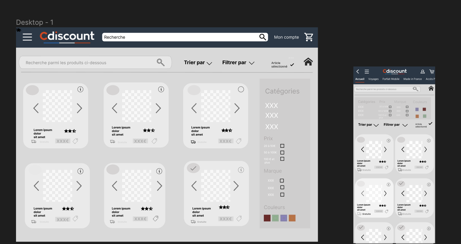 Dans le cadre d’un projet de ressource en première année, nous devions évaluer et identifier un site afin de le modifier ultérieurement. Le site devait comporter des points négatifs afin que nous puissions les améliorer en appliquant les principes de l’ergonomie et de l’UX/UI. Nous avons travaillé en groupe sur ce projet, et je me suis occupé des pages galeries des produits de Cdiscount, tant pour la version mobile que pour la version desktop, en utilisant le logiciel Figma.